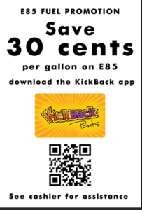 SPECIAL OFFER: Save .30 cents per gallon on E85. (Download the Kickback App or ask the Cashier for details)