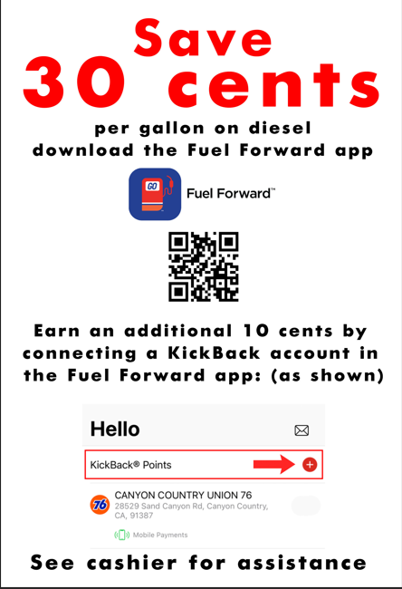 SPECIAL OFFER: Save .30 cents per gallon on diesel. (Download the Fuel Forward App or ask the Cashier for details)